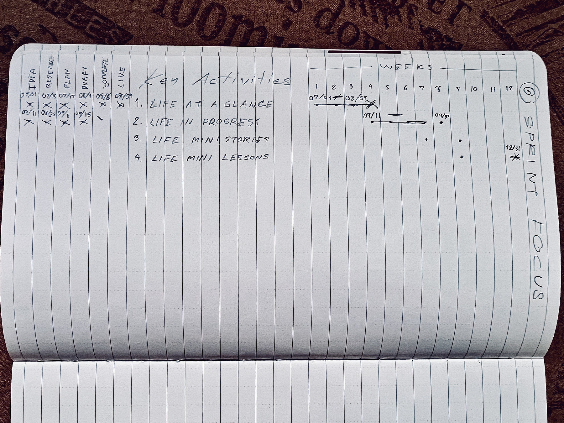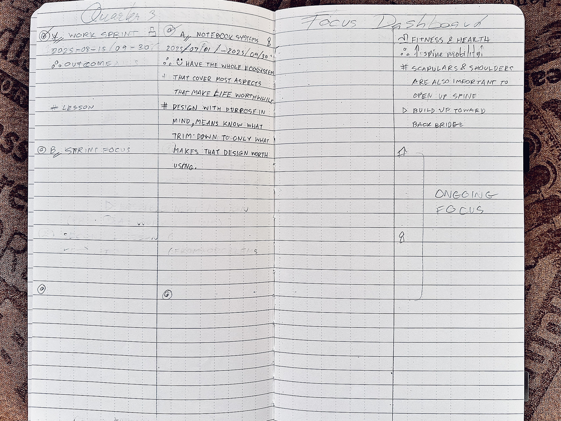 Because areas of focus and their scopes vary widely person-to-person, Life in Focus encourages customization. You can design your own layout styles, a dedicated notebook, or even go fully digital; the choice is yours. What matters is that you have a space to implement a similar approach to structured thinking and extracting meaningful takeaways. This should at least include an overview of focus areas, milestones, key activities, and reflections.
