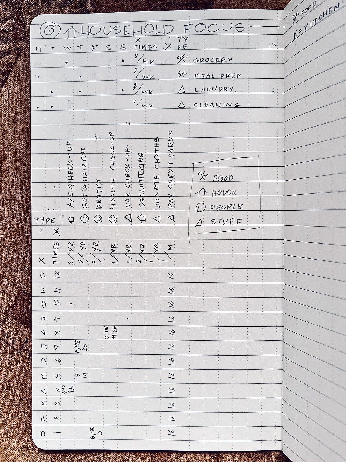 I track these using simple weekly and yearly trackersâmarking planned frequency with dots, and logging completion with dates. Simply write how many time you want to do that activity and put on a dot on your planned time, then when itâs done, you wrote the date. Thatâs it.