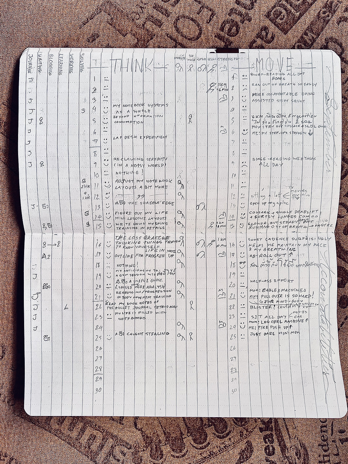 I believe that the essence of being human lies in our ability to think and move. Therefore, Iâve currently organized my accountability into these two groups, tracking daily activities related to each. (I might add more trackers later.)