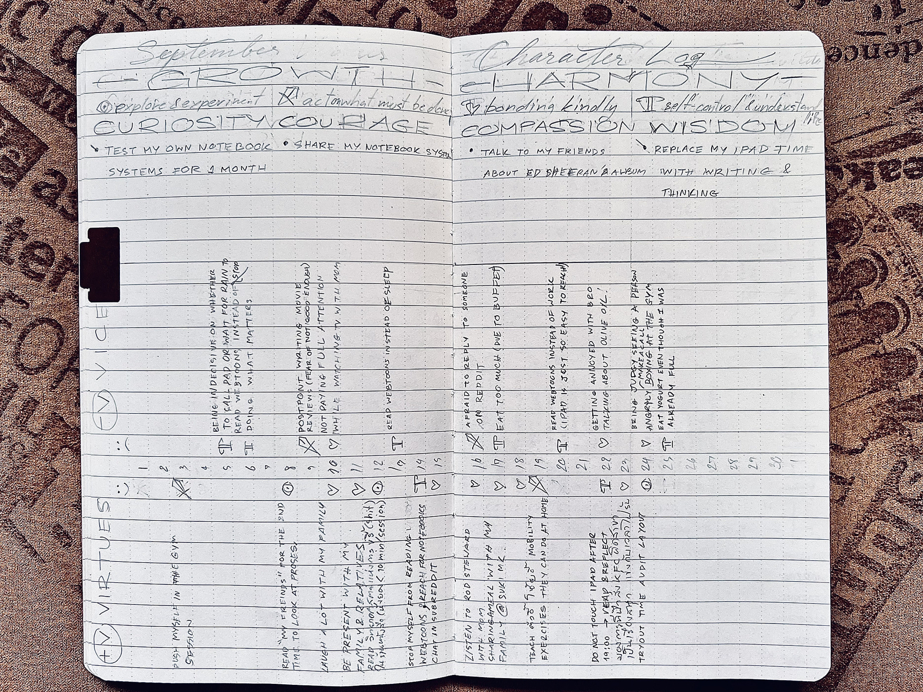 Vices and Virtues: Flip the notebook and divide two columns beside the dates.Â