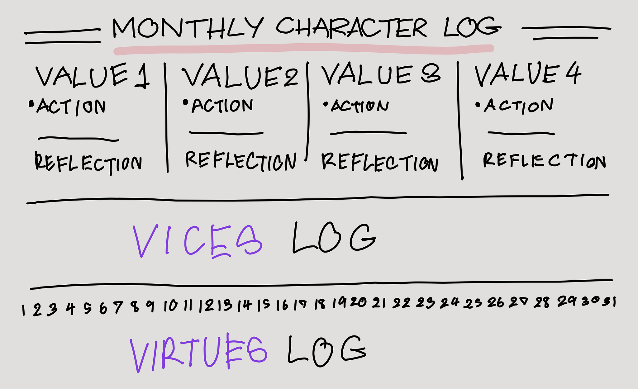 - Value-based Reflection: Reflect monthly on alignment with your values and areas to improve and strengthen your character in the following month and beyond.Â