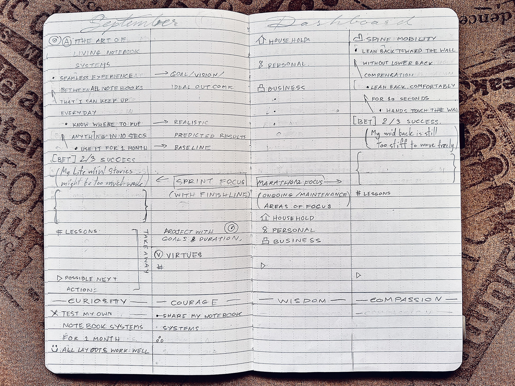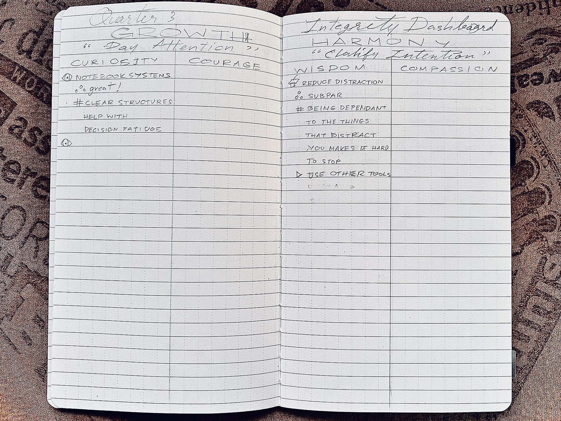 Think of this notebook as purposeful life-logging, instead of journaling (which can be spontaneous) or planning (which only sets intentions). It combines intention, commitment, and reflection, helping you visualize progress and log the breadcrumbs of your journey towards your values and focus areas.