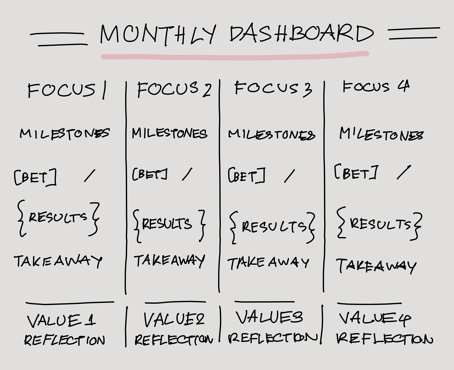 This is the focus of the month to put your energy and effort on. I recommend organising your focuses into two categories: 'sprint focuses' and 'marathon focuses' Place sprint focuses; goals with clear deadlines or completion criteria; on the left side of the page. On the right, list marathon focuses; which involve ongoing maintenance or long-term efforts; focusing primarily on routines. This way, youâll have a visual hierarchy for your focus of the month.