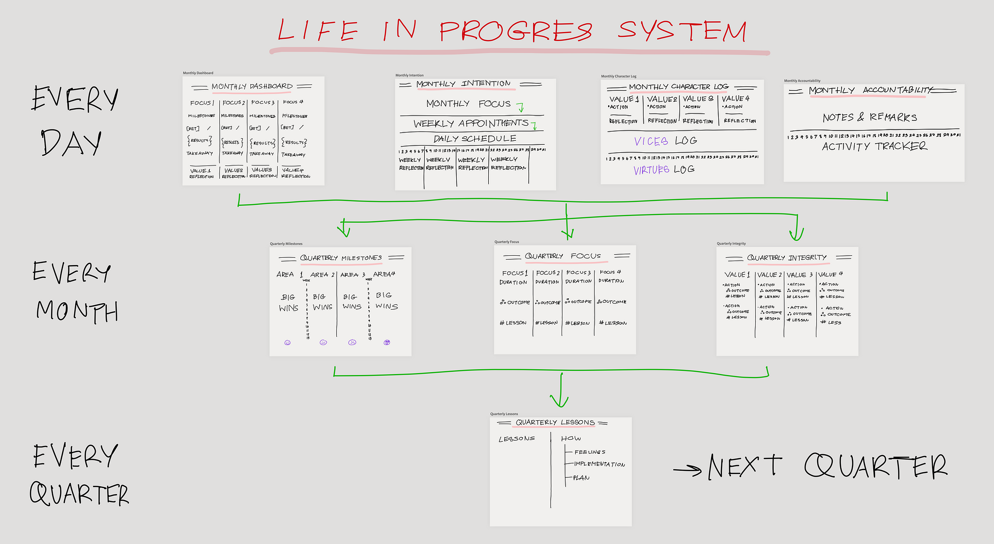 This core systems helps you understand how you live by logging the breadcrumbs of your experiences and insights at the moment, combining Monthly Growth and Quarterly Reflection.