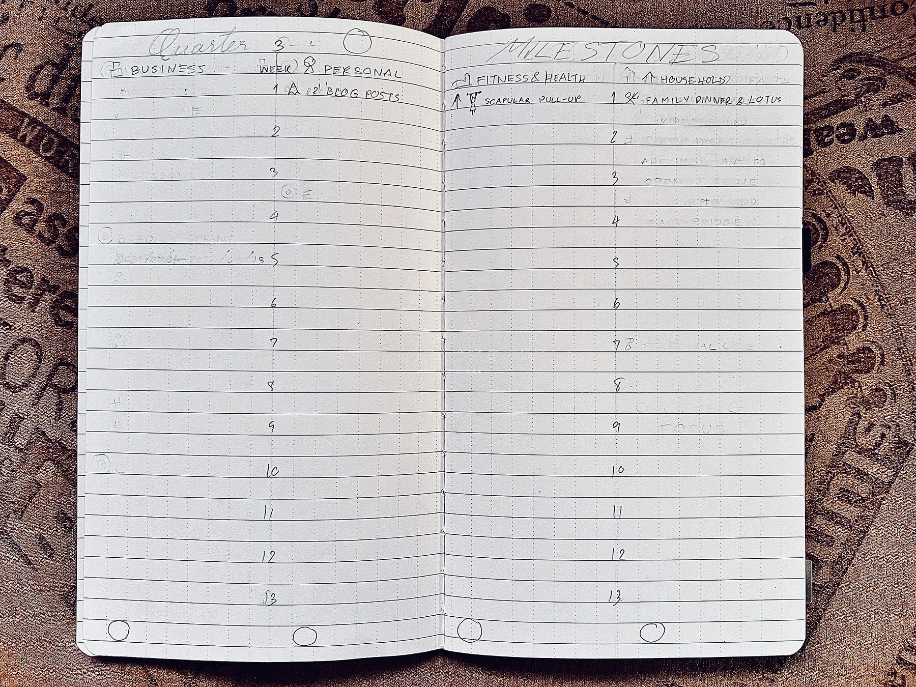 - Quarterly Milestones: List weekly big wins from Focus Forces (work, personal, health, and household)